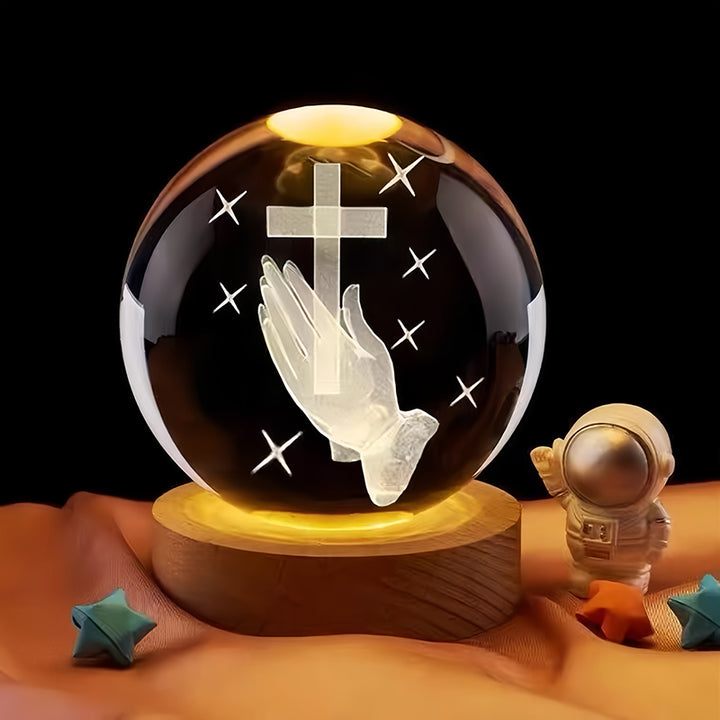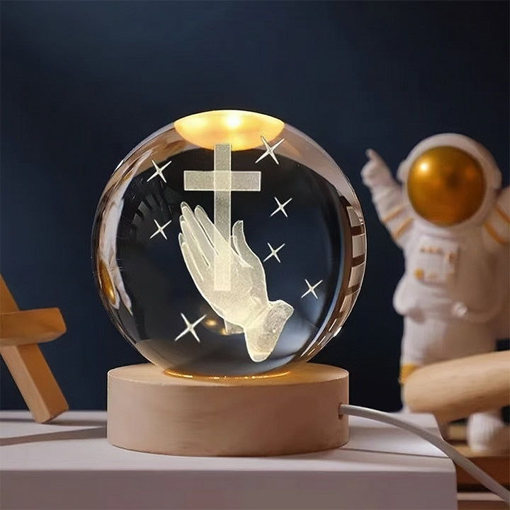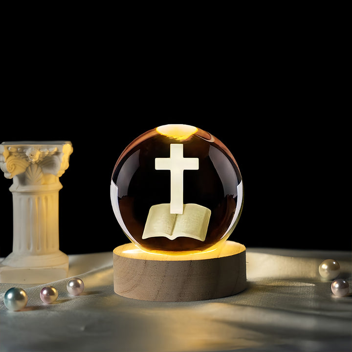Crystal Ball with Wooden Light Base Laser Engraved Cross & Bible Decorative Glass Ball Religious Gifts for Women 3D Crystal Cross Figurines for Christmas